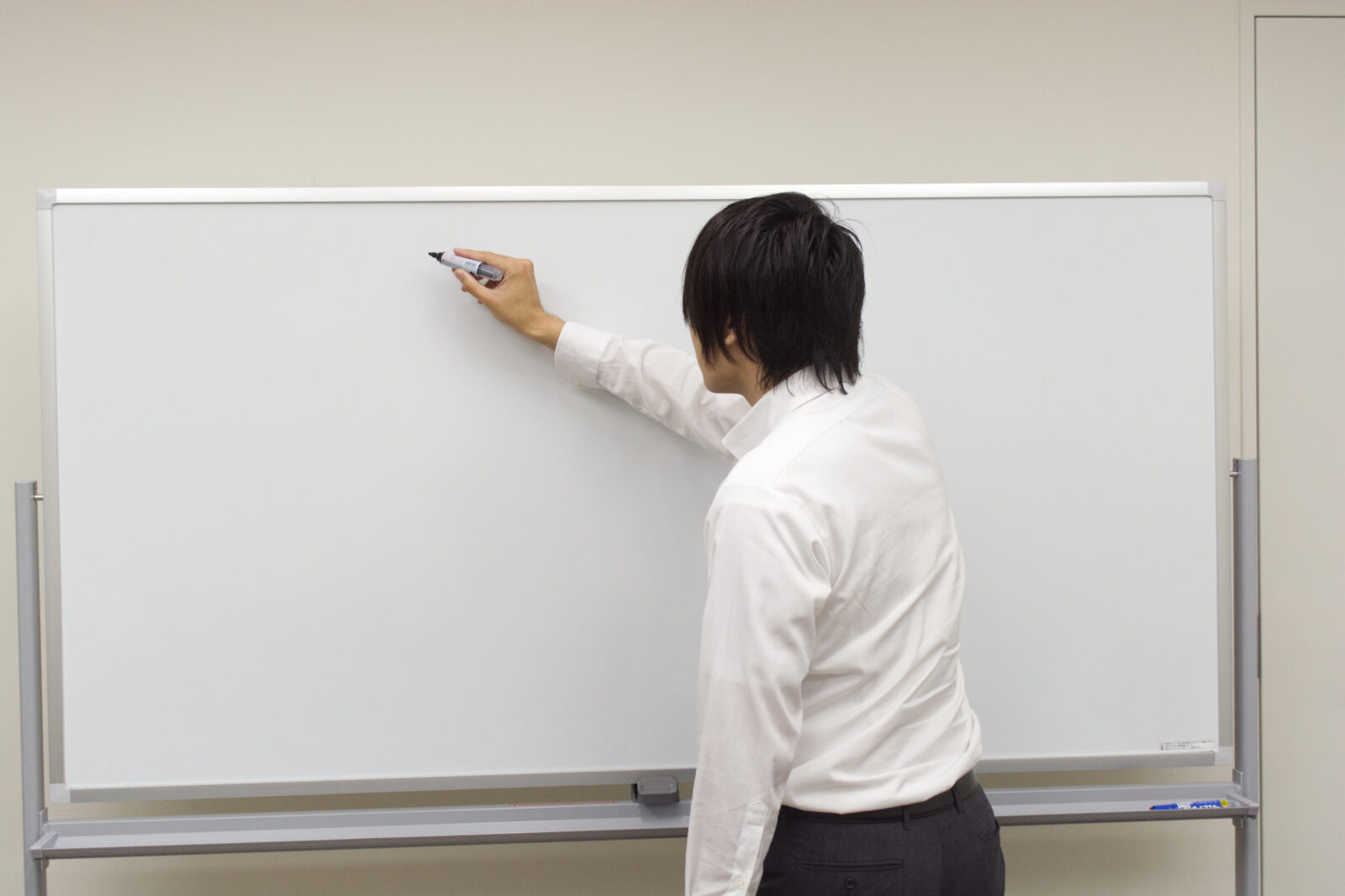 ホワイトボードに書き込む白いシャツのビジネスマン