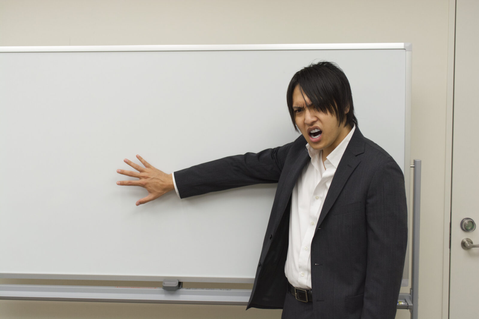 ホワイトボードを指しながら怒るビジネスマン